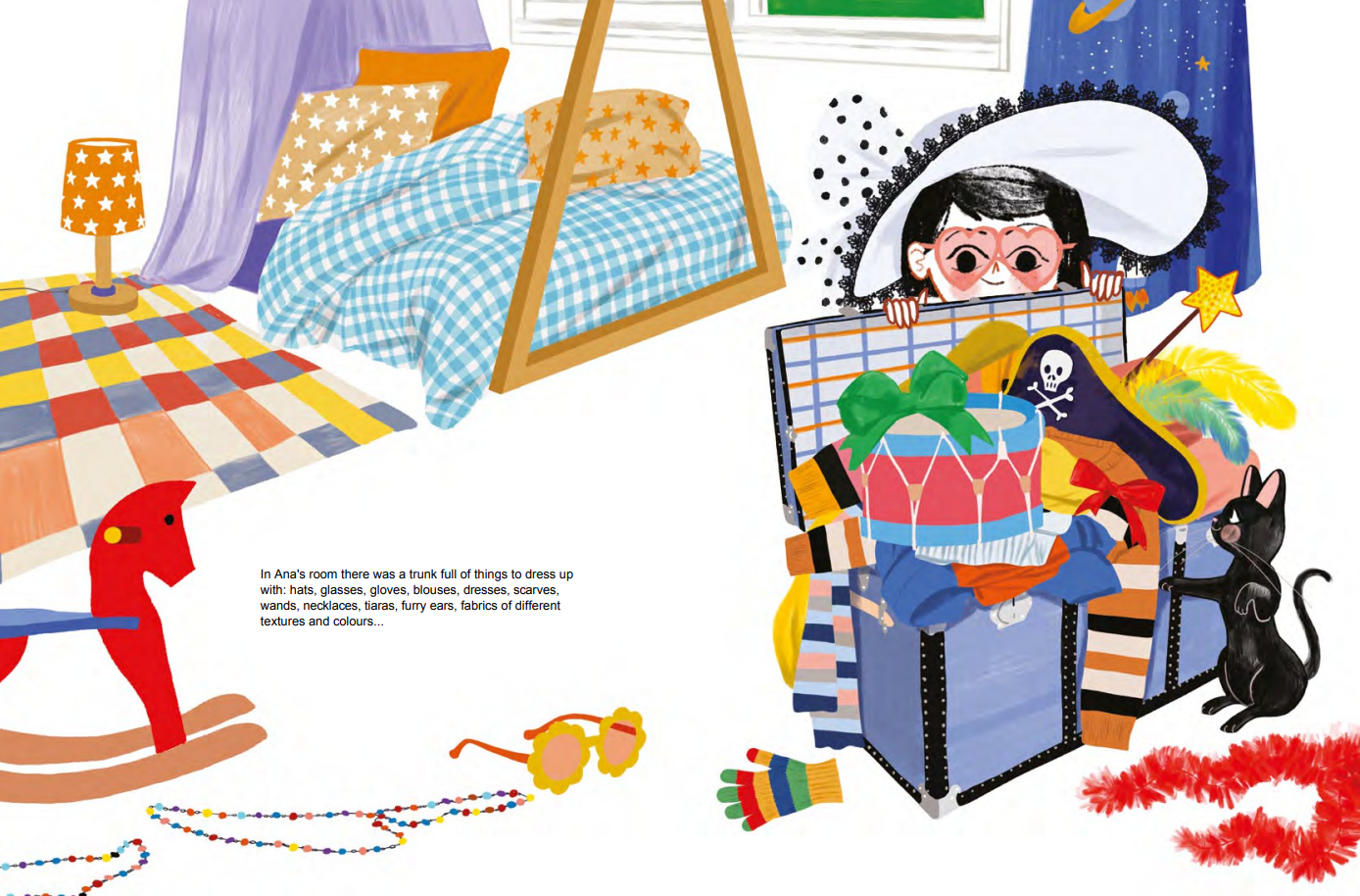 In Ana’s room there was a trunk full of things to dress up with: hats, glasses, gloves, blouses, dresses, scarves, wands, necklaces, tiaras, furry ears, fabrics of different textures and colors…