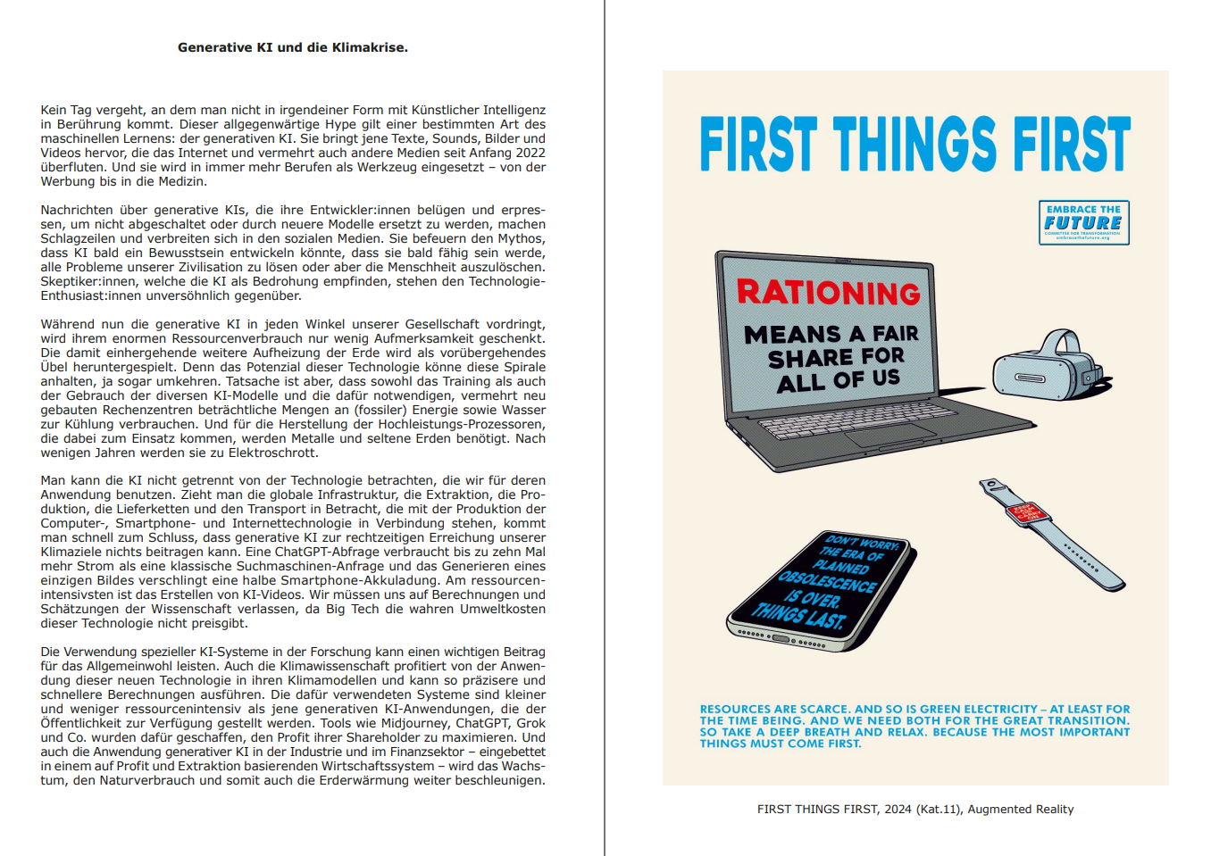 Michaela Konrad has set her campaign in the near future: at a time when the effects of global warming are putting an ever-increasing strain on our infrastructure, democracy and social cohesion and when radical change has become inevitable. This journey of words and images provides an insight into the artist’s creative process, taking on an additional dimension in augmented reality to create an immersive audio-visual experience.