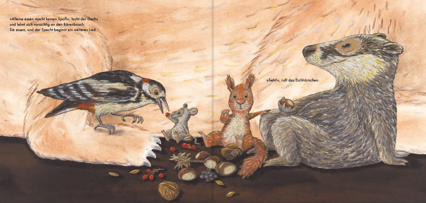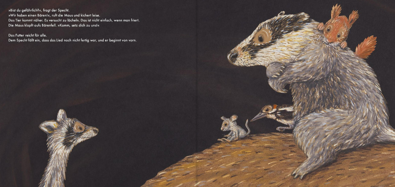 The bear that everyone has to watch out for is finally asleep. Courageously – or over-confidently? – the mouse snuggles into the bear’s warm fur. The woodpecker, the squirrel and the badger follow her. Even a strange guest is welcome. Soon everyone is celebrating the most wonderful party together on the sleeping bear. They sing, dance, eat and tell stories. Everyone laughs. Everyone? Yes, everyone. Even the bear is laughing. So much so that the whole party tumbles around.