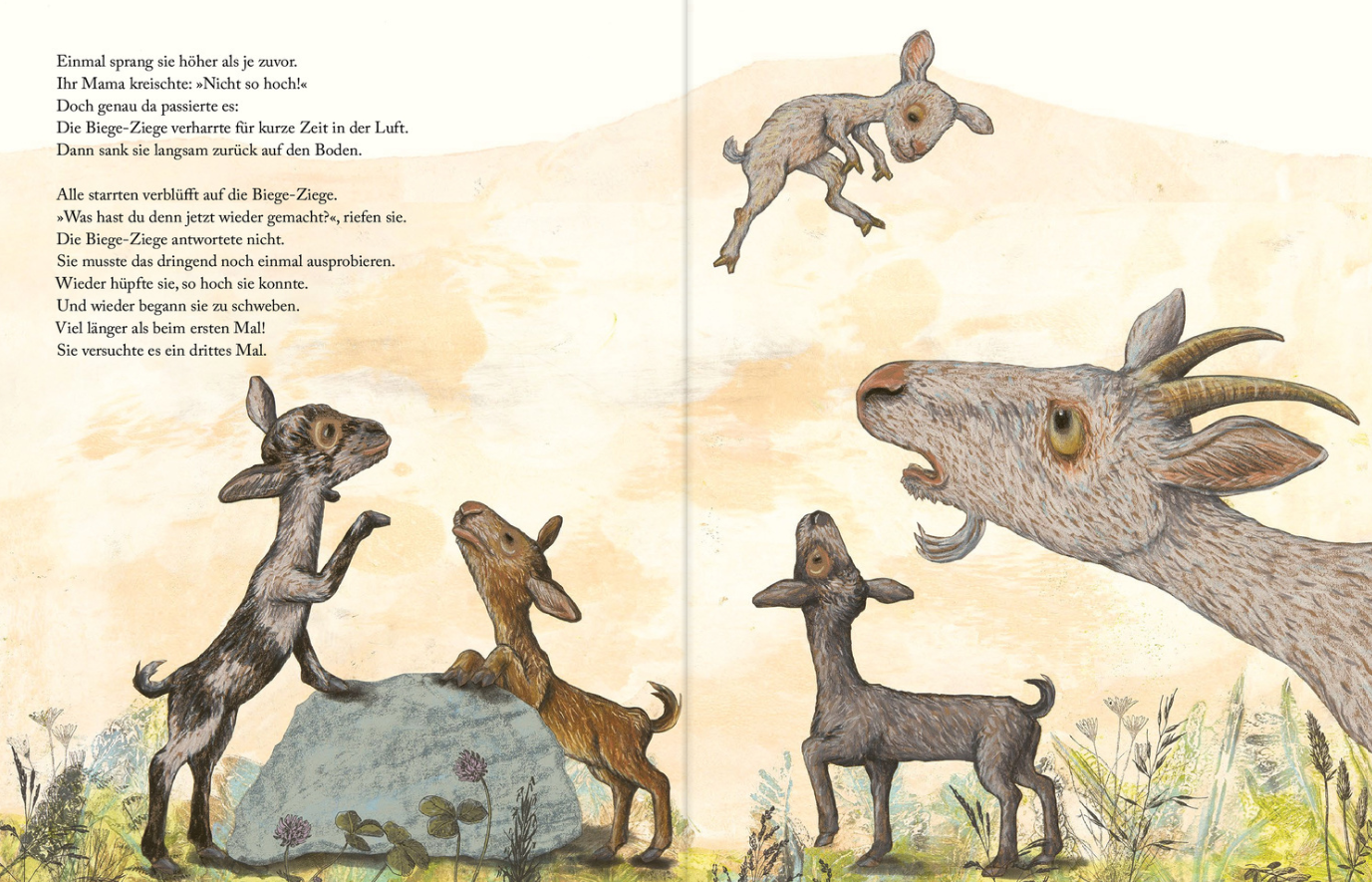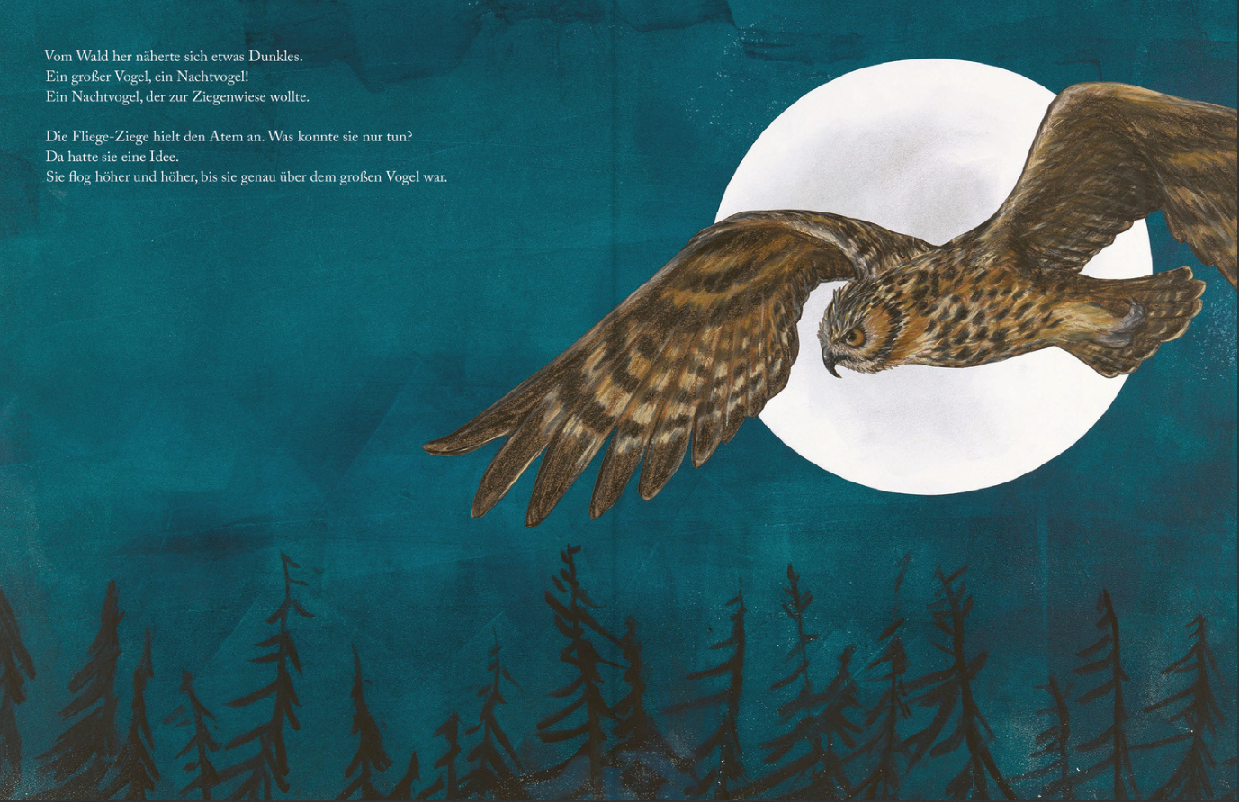 “Beware of the night birds!”, warn the worried goat mothers. Each kid has its own special character. There’s a goat that loves to hug, a goat that loves to lie down and a goat that loves to fly. – A flying goat? Who also poops on the head ofthe head goat? That’s going too far. But the fly goat is not deterred from flying. She secretly takes to the skies, experiences great happiness – and saves the other goats from great danger.